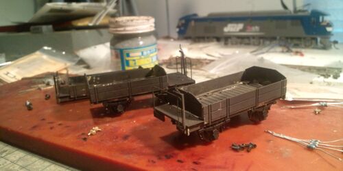 黒染めしてあったアルモデルの小型無蓋車に塗装した下回りを付けてみましたが・・・ 車体は黒染とウエザリングブラックで煤けているのに対し,下回りは半艶塗装でどうもバランスが悪いです。下回りはつや消し黒で塗ったほうが良かったかもしれません。 専用…
