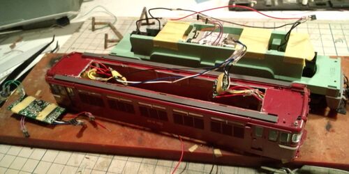 LEDの準備が出来ましたので,早速車体に取り付けていきます。 LEDの取り付けが終わりました。ここまで組み立てたところで取り付け中の写真を撮るのを忘れていたことに気が付きました。 ヘッドライトは導光材に1.2mmの穴を開けてLEDを差込み,…