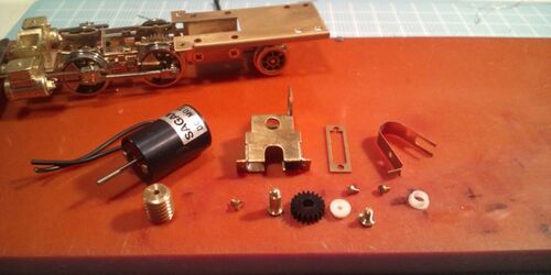珊瑚模型店のOナロー版木曽ボールドウィンの製作 その3です 下回りにモーターを付けて回転チェックをします。大きな車体には似合わない,小さなモーターが付属しています。 ギヤボックスを下回りに組み込みました。軽く回るようにするためには多少の調整が…