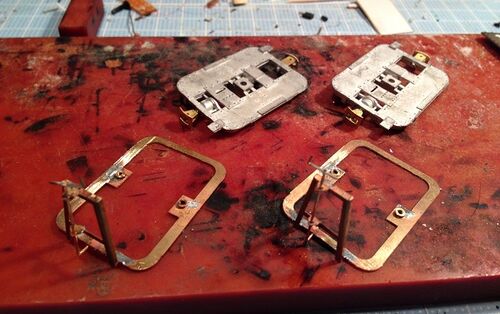 珊瑚模型店のエコノミーな運材台車を組み立てました 台車部分はホワイトメタルと真鍮部分を貼りあわせます。真鍮の部分は予め半田で組み,ホワイトメタルには連結器を付けておきます。 エポキシ接着剤で付けますが,しっかり付くまでクリップで押さえました…
