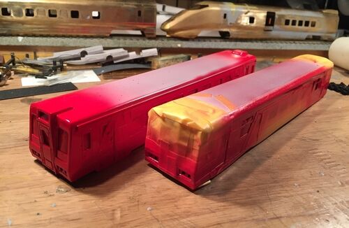 スタジオHOのペーパー製三陸鉄道36形気動車の製作 その25です。 マスキングの終わった車体を赤で塗ります。 ペンキがしっかり乾いたら,マスキングテープを剥がしていきます。一喜一憂しながらの作業となります。 1両目は大体OKです。 2両目は・・…